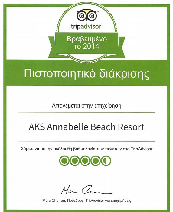 AKS Annabelle Beach Resort can be found once more among the elite of hotels worldwide, since it has been awarded with the Certificate of Excellence 2014 by one of the most illustrious travelers’ websites, Trip Advisor.